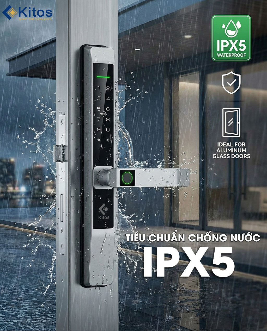 Khóa được trang bị tiêu chuẩn chống nước IPX5, cho phép chịu được nước mưa hắt và độ ẩm cao. Điều này giúp Kitos AD383 Pro duy trì khả năng hoạt động ổn định, giảm thiểu rủi ro hư hỏng linh kiện bên trong, đặc biệt phù hợp với các vị trí cửa nhôm thường xuyên tiếp xúc với môi trường bên ngoài.